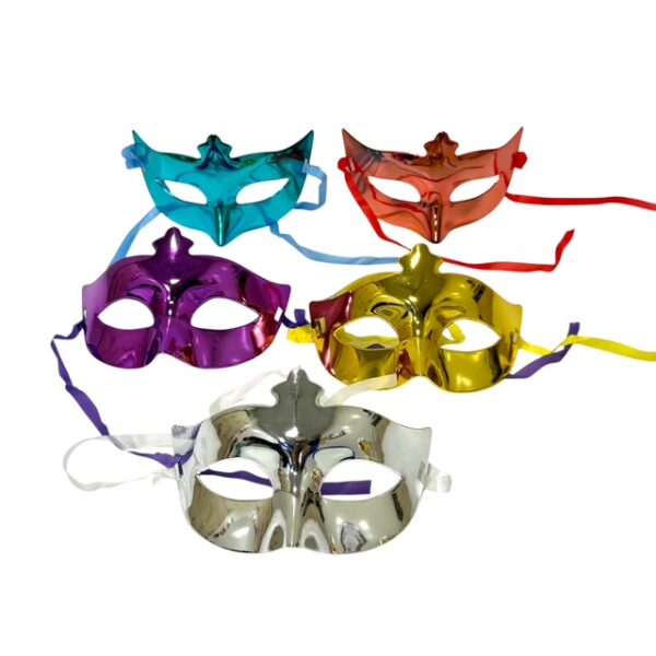 Antifaz liso de material pvc ligero, de color solido con acabado espejo metalico, con cintas de saten a los lados para un ajuste cómodo y seguro.