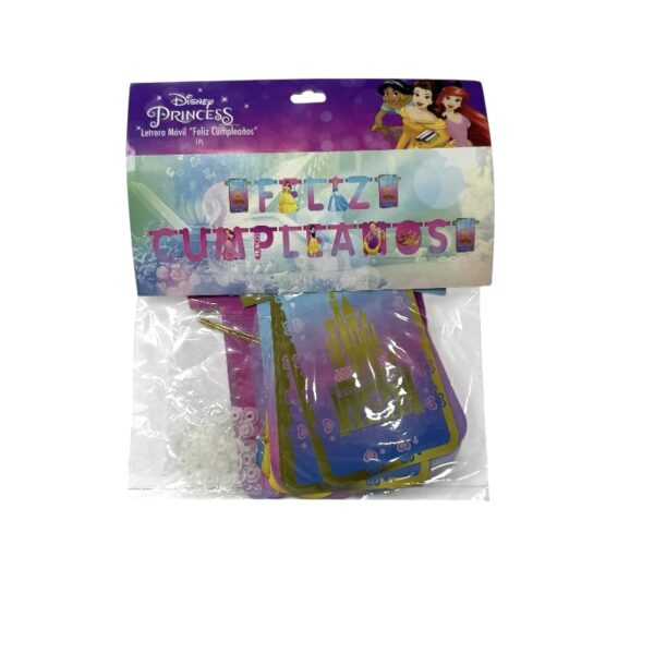Banner movil de ”Feliz Cumpleaños” con temática de las encantadoras Princesas Disney, hecho de  material carton reutilizable, resistente y duradero.