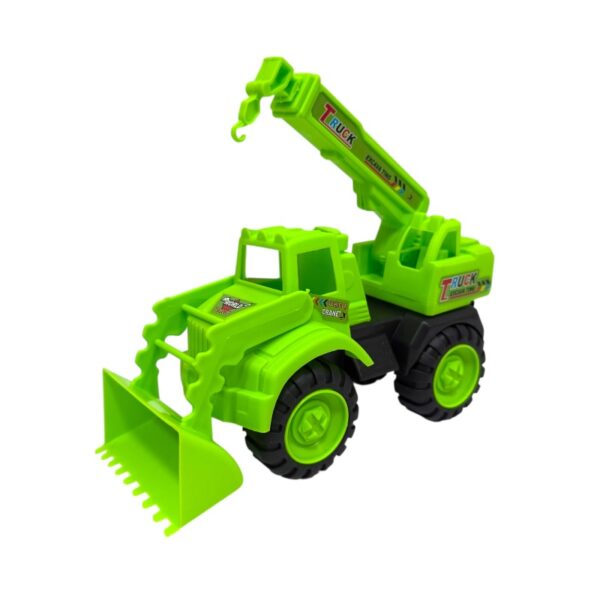 Camion de construccion 2 en 1, con diseño de grua con pala excavadora, cuenta con brazo de grua trasero articulado pala delantera movil y , de material pvc resistente.