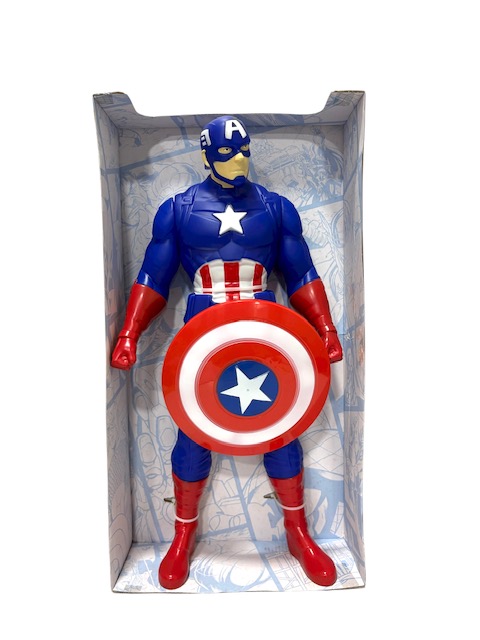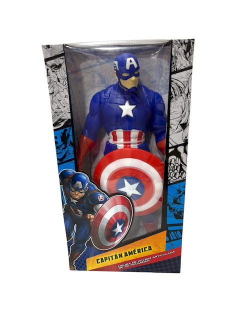 Figura de coleccion en 3D, Capitan America del universo de Marvel porta un traje iconico Rojo y Azul, con un escudo como accserorio principal, con dimensiones de 25.25x27x13 cm.