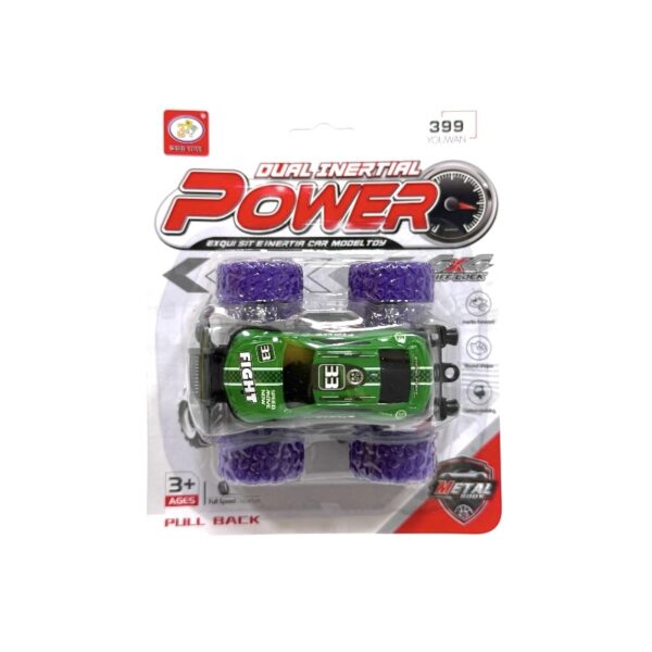 Carro de metal en blister, con aspecto monster truck, juguete de friccion y retroimpulso, perfecto para el entretenimiento de los niños grandes, disponible en diferentes colores.