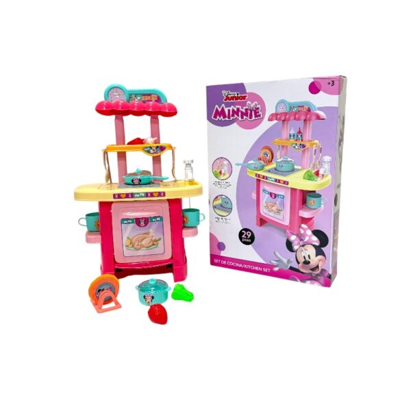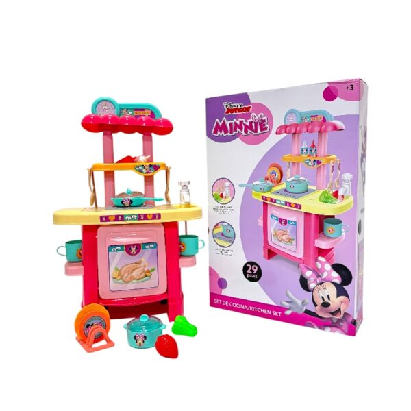 Cocina en tamaño 3d de minnie que incluye 29 piezas: bandejas, utencilios de cocina, tazas, mostaza, salsa de tomate, sarten con tapa, olla con tapa, frutas y vegetales, grifo de agua, agarradera y huevo, para tener toda un experiencia, materiales de pvc, medidas aproximmadas de empaque:22x38x57c.