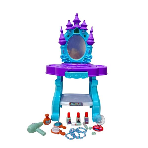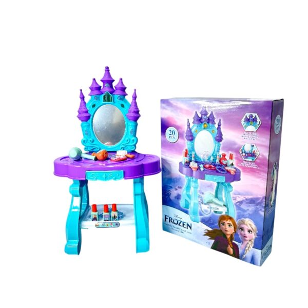 Castillo de frozen en tamaño 3d con 20 piezas que incluyen: pulsera y aretes de juguete, perfume de juguete, pintalabios de juguete, pintauñasde juguete, sombras de ojo de juguete, secador de callebo de juguete y cepillo, de material de pvc con mesita y espejo con torre de castillo de frozen, medidas aproximadas de empaque: 23x42x55cm.