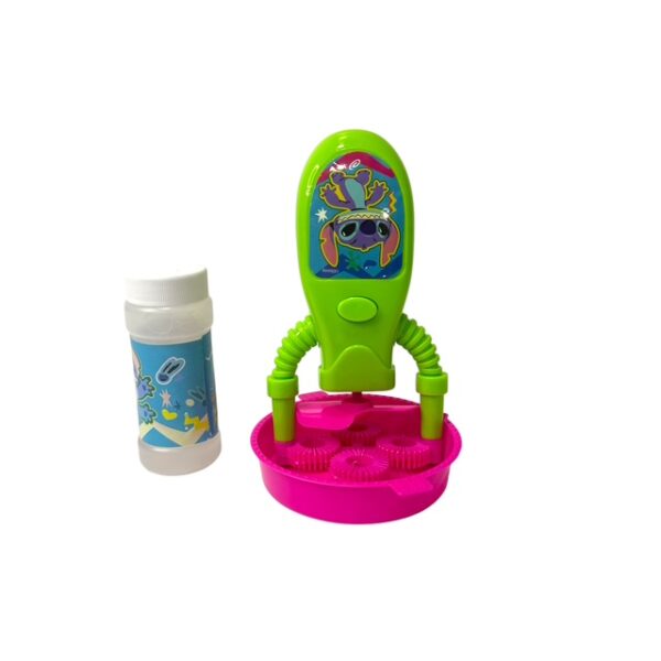 Set lanzador de burbujas automatico en blister con diseño alegre de Stitch, mecanismo tipo helice o ventilador, incluye un envase de la solucion para burbujas. Perfecto para llevar la alegria y energia de Stitch a cualquier aventura al aire libre.