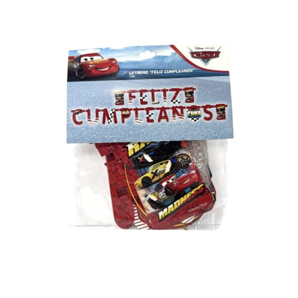 Banner movil de ”Feliz Cumpleaños” con temática de Cars de Disney Pixar, hecho de material carton resistente y duradero. Ideal para fiestas temticas de carreras de auto.