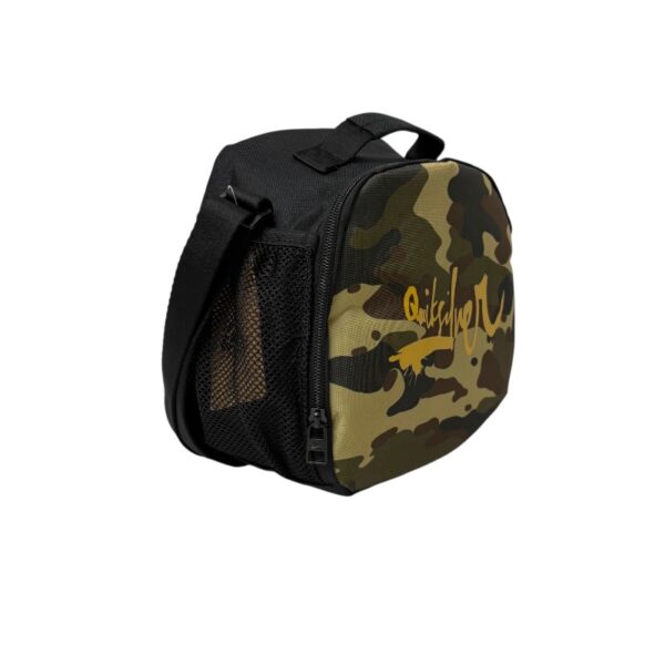 Lonchera Termica Quiksilver, cuenta con un asa superior y una correa ajustable brindando comodidad al transportar de color negro en la parte de atras y un diseño en la parte de adelante con camuflaje en tonos verdes y cafe que incluye 1 compartiento en la parte latera para cargar botellas, medidas aproximadas 27x10x21 cm.