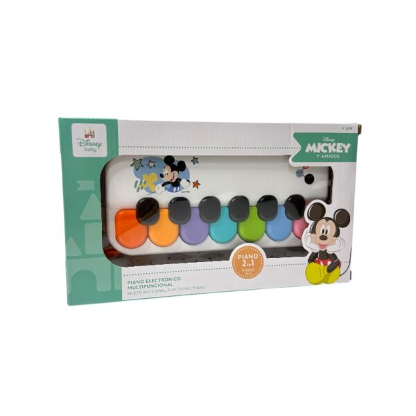 Piano del ratoncito Mickey Mouse, tiene 8 teclas de colores y una decoracion de Mickey en la parte superior.