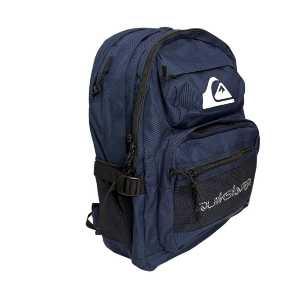 Mochila/bolson tela de polyester de Quiksilver, con 5 compartimientos en la parte frontal y 2 compartimientos a los laterales para cagar botellas, ziper metalico, cintas traseras ajustables anchas y acolchonadas, con un deposito para portar laptop en la parte interior, medidas aproximadas 45x28x12 cm.