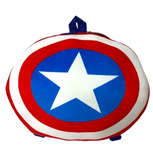 Mochila de peluche con la figuraredonda con diseño del escudo del capitan america, de material poliester con dos asas en la parte de atrar, medida aproximada: 28x35x36m.