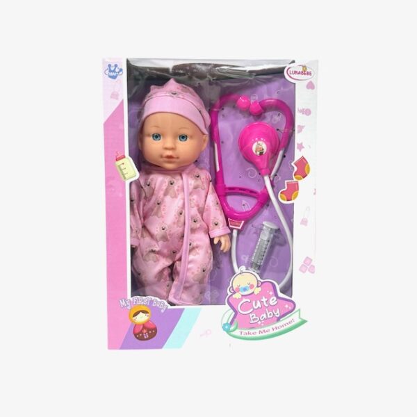 Muñeca bebé ahulada con kit medico de 2 accesorios de pvc, estetoscopio de juguete, jeringa de juguete, el set biene en una caja atractiva y resistente, una tierna muñeca bebé lista para ser examinada y cuidada, su diseño es ideal para las manos pequeñas la sostengan y la acunen, medidas aproximadas: 22x9x30cm.