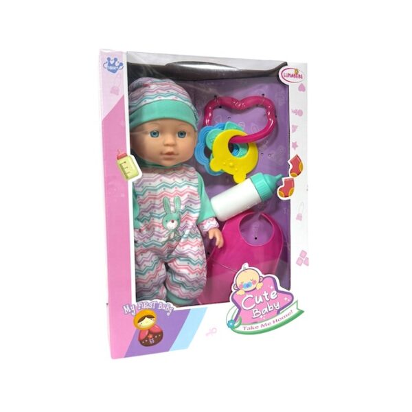 Muñeca Bebé con 3 accesorios de pvc: pacha, babero, sonajero, muñeca ahulada suave y abrazable fabricado con un material seguro y duradero , este set de juego no solo es entretenido, si no que tambien impulsa el dasarrollo social y emocional enseñando empatia, medidas aproximadas: 22x9x30cm.
