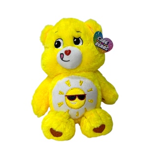 Peluche de oso cariñosito (funshine bear) con su inconfundibles sol brillante en la barriga, de material poliesterde felpa, ojos de pvc y unos corazones bordados en las patitas, viene en una caja, medidas aproximadas:33x61x28cm.