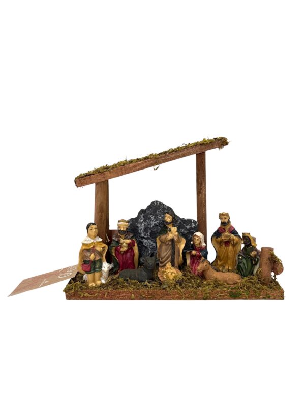 Pesebre nacimiento de Jesus completo con portal rustico, el set incluye el pesebre con el techo y las figuras: niño jesus, los 3 reyes magos, el buey, la mula, el pastor, maria y Jose, las figuras estan elaboradas en resina de alta calidad, medida aproximada: 15.50x20x7.5cm.