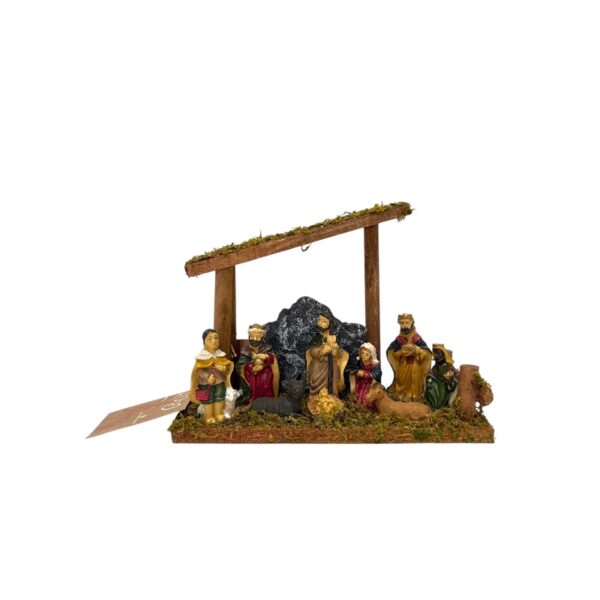 Pesebre nacimiento de Jesus completo con portal rustico, el set incluye el pesebre con el techo y las figuras: niño jesus, los 3 reyes magos, el buey, la mula, el pastor, maria y Jose, las figuras estan elaboradas en resina de alta calidad, medida aproximada: 15.50x20x7.5cm.