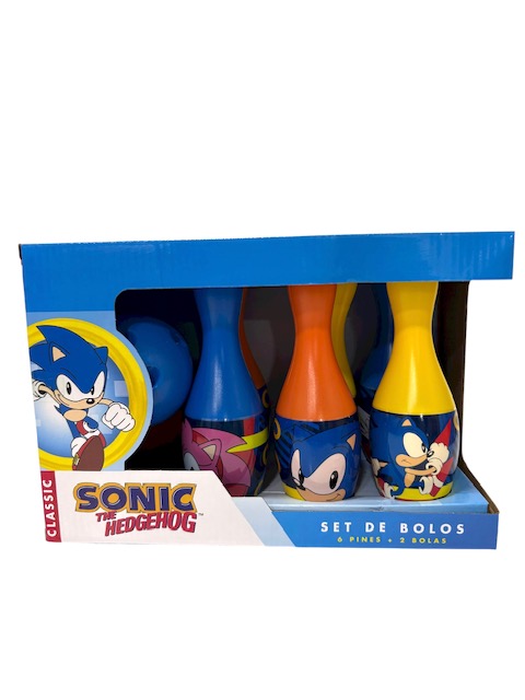Set de boliche con personajes de Sonic, con 6 piesas de pinos de PVC con 12 cm de altura y 2 bolas.