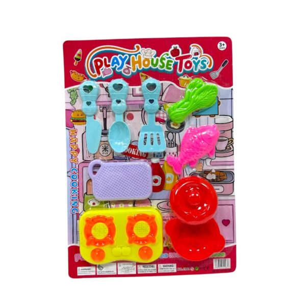 Set de cocina de 9 piezas de material pvc seguro, incluye: cuchillo de juguete, cuchara, espatula, tabla de picar, pescado, vegetal, mini estufa, sarten y tapadera de sarten.