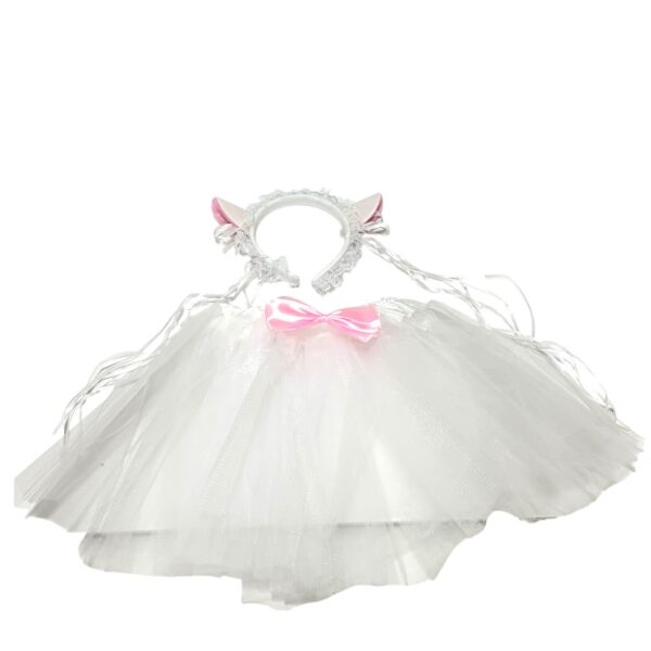 Set de tutu con falda de tul blanco con una chonga rosada en la cintura y una diadema con orejitas de gatita, medida aproximada: 58x48cm.