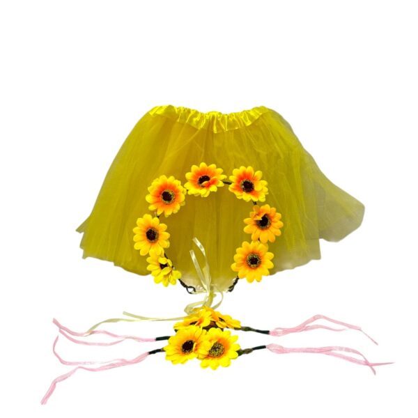 Set de tutu con falda de color amarillo vibrante con volumen, incluye una diadema/corona de flores de girasol y con accesorios adicionales para usar en las muñecas de las manos o en los tobillos, un diseño alegre , medidas aproximadas:58×48