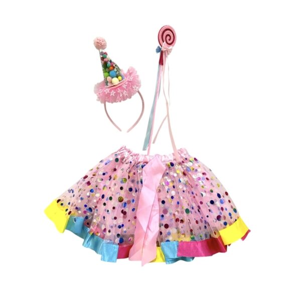 Conjunto de tutu de fiesta con diseño en la falda de multicapa de colores pastel con volumen con un toque de liston para un moño en la cintura, con diadema con el diseño de gorro de cumpleaños transparente con pompones dentro, incluye una barita de diseño de paleta de caramelo, medida aproximada: 58x48cm
