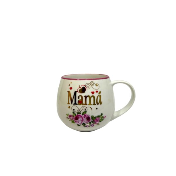 Taza de ceramica con estampado de flores y la palabra mamá, con orilla de color y fondo blanco, medidas aproximadas: 9×8.20×5.10cm.