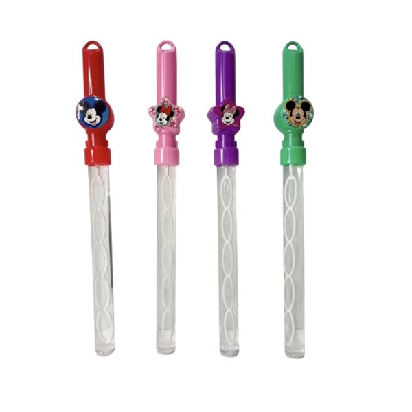 Varita de burbujas con diseño de los iconicos personajes de Disney Mickey y Minnie Mouse, envase de plastico resistente diseñado para un uso sencillo y seguro. Apto para niños desde los 3 años.