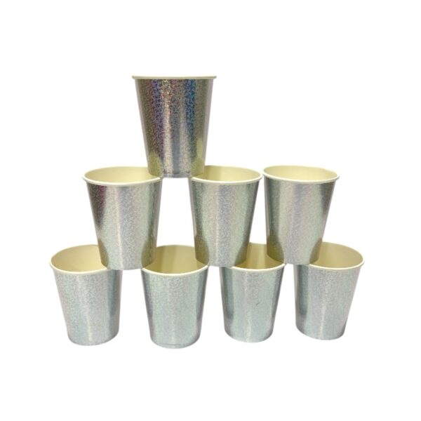 Vaso desechable de 9 onzas (266 ml) con un acabado atractivo en color plateado metalico. Perfectos para servir con estilo, combinando la elegancia, lujo y sofisticacion.