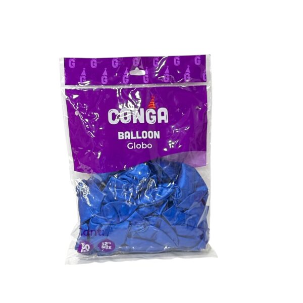 Set de globo/vejiga conga, incluye un tono color azul metalico(50 piezas), fabricados con latex y resistente, son aptos para inflar con aire o con helio, medida aproximada: 12cm.