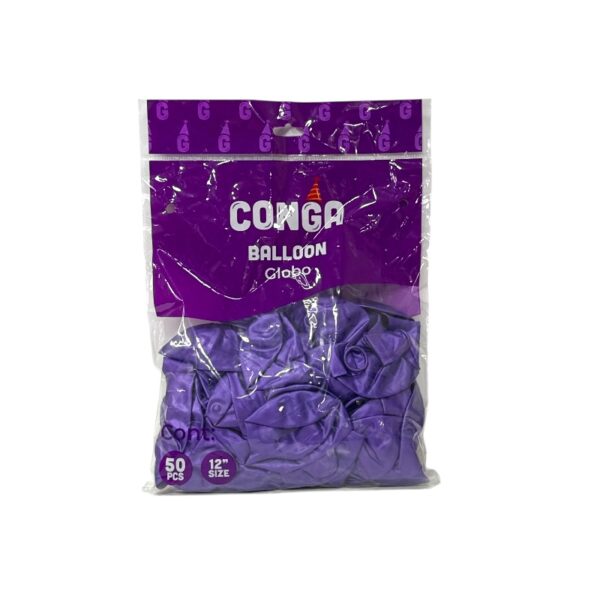 Set de globo/vejiga conga, incluye un tono color morado metalico(50 piezas), fabricados con latex y resistente, son aptos para inflar con aire o con helio, medida aproximada: 12cm.